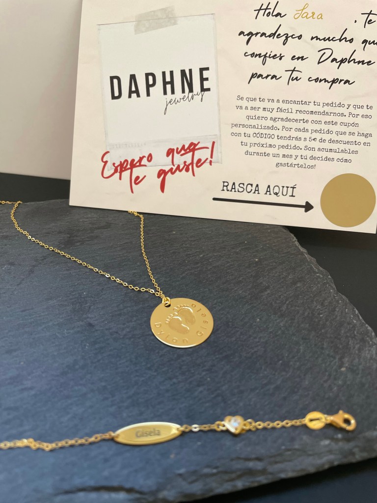 Bueno, pues yo, María, he comprado en la tienda de Daphne Collection y me ha llegado la tarjetita con mi código. No le doy mucha importancia, pero cuando voy luciendo mi joyita la gente me pregunta de dónde es… Aprovecho y les cuento de que además si compran con mi código tendrán un 20% de descuento. Me resulta muy fácil hacerlo porque realmente estoy contenta con mi compra. Automáticamente, por cada compra que se hace con mi código yo voy sumando 5€.